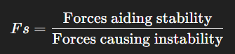 Wall stability is analyzed using factors of safety (Fs):